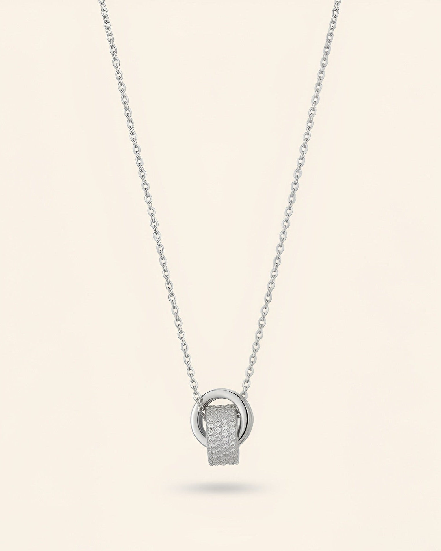 The Aurelia Necklace reflects refined elegance through its modern circular design and shimmering pavé zirconia detail. The interwoven elements symbolize balance, continuity, and the beauty of connection.