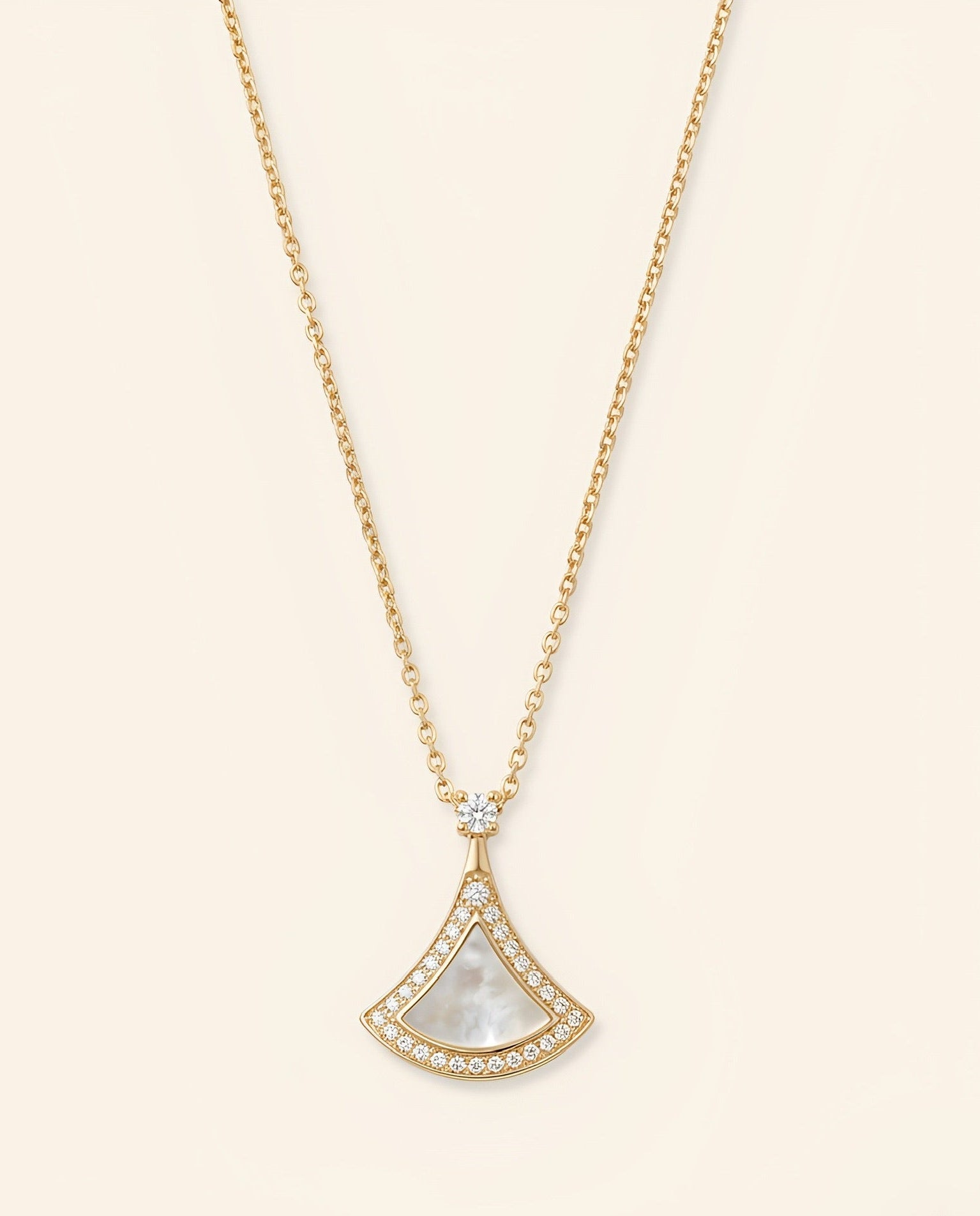 Inspired by the graceful shape of a traditional fan, the Serena Fan Necklace reflects elegance, harmony, and timeless beauty. The soft nacre center radiates a gentle glow, while the surrounding zirconia adds a delicate sparkle.